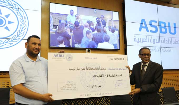 L’Union de radiodiffusion des états arabes (ASBU) a remis, jeudi, une partie des recettes du festival arabe de la radio et de la télévision, organisé fin juin 2025 soit un montant de 70 mille 940 dinars, à l’association des villages SOS, au cours d’une cérémonie organisée au siège de l’ASBU.