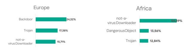 Au Maroc comme ailleurs sur le continent africain, les attaques prennent principalement la forme de downloader « not-a-virus » (55 %), suivis des fichiers suspects ou exploits classés sous l’étiquette DangerousObject (14 %), puis des chevaux de Troie (13 %). En Europe, ce sont les portes dérobées (24 %), les chevaux de Troie (17 %) et les downloader (16 %) qui dominent le paysage des menaces.