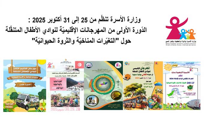 Par ailleurs, le gouvernorat du Kef organise du 28 au 30 octobre 2025, une activité éducative et d’animation sur le thème “les changements climatiques et la richesse animale” avec la participation des commissariats régionaux du Kef, Jendouba, Béja et Bizerte (district 1). Ces activités ciblent les délégations de Kalaa Khisba et le village “Mallag”.