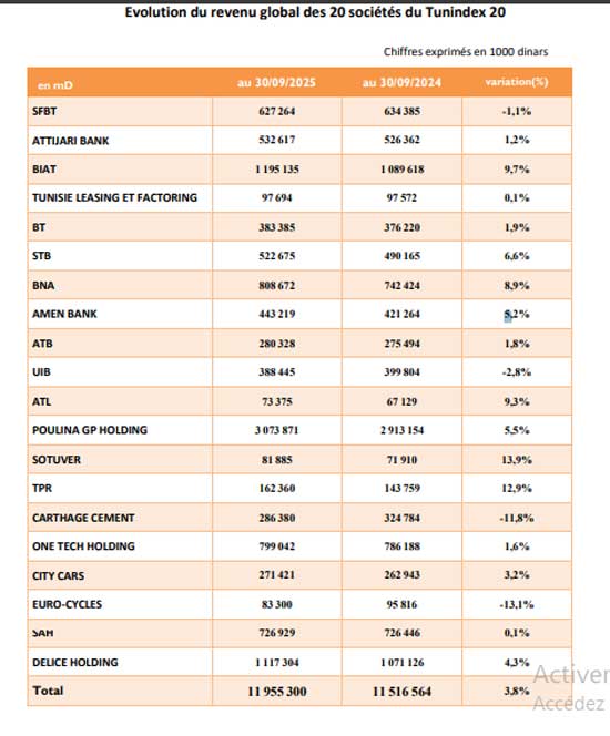 Les 20 sociétés composant le Tunindex20, représentant les principales capitalisations de la cote, concentrent à elles seules 12 milliards de dinars, soit 65 % du revenu global du marché. Ce chiffre marque une progression de 3,8 % par rapport à la même période de l’année précédente, confirmant le rôle central des grandes entreprises dans la performance globale de la Bourse de Tunis.