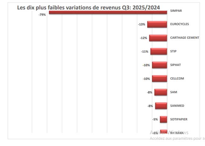 Selon les données publiées par la Bourse de Tunis, plusieurs entreprises issues de secteurs variés ont enregistré une baisse notable de leurs revenus à la clôture du troisième trimestre 2025.