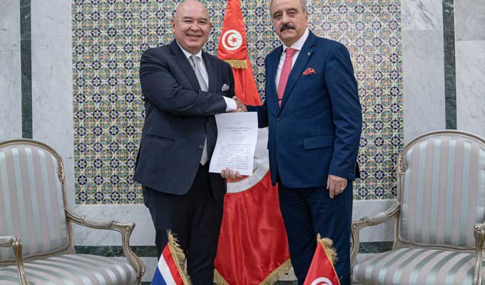 Le Ministre des Affaires Etrangères, de la Migration et des Tunisiens à l’Etranger, Mohamed Ali Nafti, a reçu, mercredi, Fabio Chinda, qui lui a présenté une copie figurée de ses Lettres de Créance en tant qu’Ambassadeur du Royaume de Thaïlande auprès de la République Tunisienne, avec résidence à Rabat.