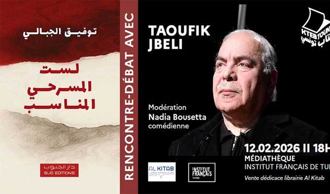 La médiathèque de l’Institut français de Tunisie (IFT) accueillera, le jeudi 12 février, une rencontre-débat avec le dramaturge, metteur en scène et comédien Taoufik Jebali autour de son dernier ouvrage en arabe, “Je ne suis pas l’homme de théâtre qui convient”, publié par Sud Éditions en novembre 2025.