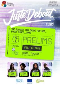 Porté par un immense succès lors de sa première édition, Juste Debout devient un carrefour incontournable pour la jeunesse tunisienne et internationale. De nombreux danseurs et danseuses s’affronteront sur scène pour démontrer leur virtuosité dans les quatre styles de danse debout : popping, locking, house et hip-hop.