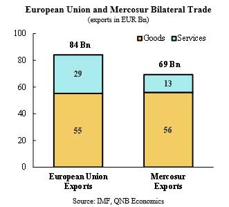 First, prospective gains in trade volumes are significant, especially for the smaller and relatively less trade-integrated Mercosur. Total bilateral trade in goods and services is close to EUR 153 Bn per year, which represents less than 1% of total combined GDP. In comparison, this is only a fraction of the 3.5% figure for bilateral trade in goods and services between the US and the EU, indicating a large margin for increasing bilateral flows.