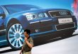 Un homme passe devant une affiche publiciatire d'Audi, le 28 juillet 2003 (Photo : Str) FRANCFORT (AFP) A l'étroit en Europe, où la tendance...