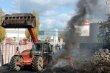 échargent des palettes et des pneus devant les abattoirs Charal, le 10 novembre 2010, à Cholet, dans le cadre d'une opération de blocage. (Photo...