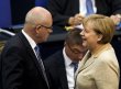 ère allemande Angela Merkel (d) et le président du groupe parlementaire de la CDU Volker Kauder, le 29 septembre 2011 au Bundestag à Berlin...