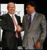 Le nouveau PDG d'Arcelor Mittal Roland Junck (g) avec Lakshmi Mittal lors d'une conférence de presse, le 4...