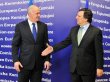 ésident de la Commission européenne JoseManuel Barroso (D) salue le Premier ministre grec Georgios Andreas Papandreou le 17 mars 2010 à Bruxelles. (Photo :...